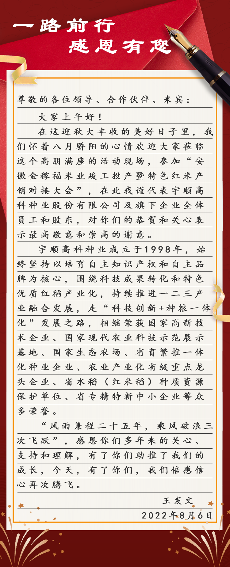 宇順高科種業(yè)股份有限公司創(chuàng)始人王發(fā)文代表公司及旗下全體員工和股東向各位領(lǐng)導(dǎo)、合作伙伴致以最高敬意和崇高的謝意。安徽金稼福米業(yè)有限公司總經(jīng)理汪孟元向蒞臨嘉賓致歡迎詞。